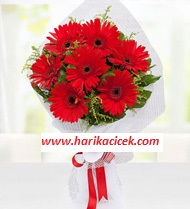 7 adet kırımız jerbre 1 ci sınıf jerberelerden hazırlanmış ürün cipso ve yeşillikler 1 ci sınıf hazırlanmış ürün