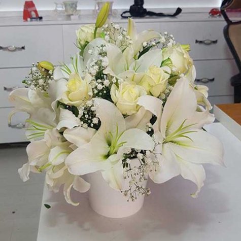 beyaz seramik vazoda 5 beyaz gül ve 11 beyaz lilyumdan oluşan arajman beyaz gül masumiyeti beyaz lilyum zarifi ve güveni simgeler beyazın en güzel halini sevdiginz kişiye göndermek istermisinz