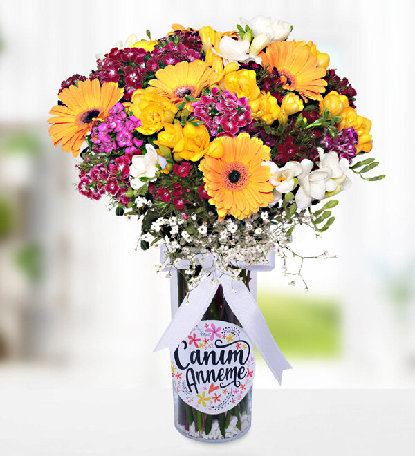 Renkli gerbera ve kır çiçekleri ile ortaya buram buram bahar kokan bir aranjman çıktı. Kır Çiçekleri Vazosu ile annenize kucak dolusu bir bahar kokusu hediye edebilirsiniz. Not: Karışık kır çiçekleri ürünlerimiz, mevsimine uygun taze çiçekler ile hazırlanacaktır.