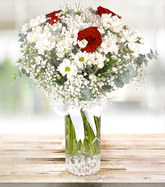 kırçiçekleri içerisinde 3 adet kırmızı güller her bayan kır çiçeklerini sever ve güllerde sevgiyi anlatır bir gün degil hergun mutlu edersiniz sevdiginiz bayanı