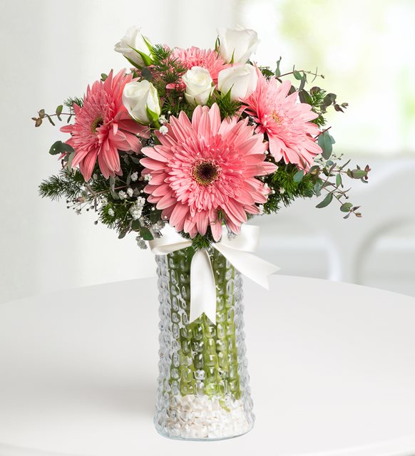 Sevdiklerinize yaz mevsimi sıcacık ve büyülu atmosferini yaşatmak istermisiniz silindir cam vazoda yeşilliklerle süslenmiş pembe gerberelar ve beyaz güllerle hazırlanmış yaz büyüsü cicek aranjmanı sevdiklerinize hayatına yaz mutluluğu katacak