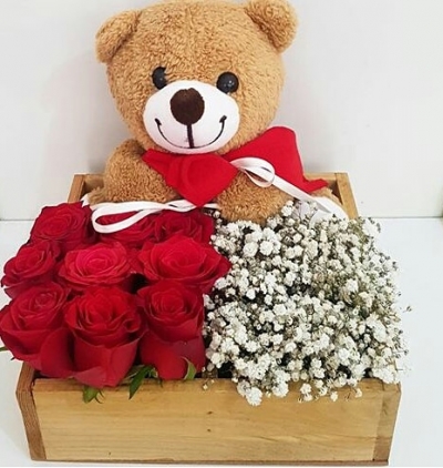 ahşap kutuda ayıcık ve kırmızı güller cipsodan oluşan arajaman