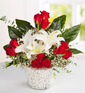 beyaz lilyumlar il kırmızı güllerein buluşdugu estetik arajaman olarak özel tasarlanmış ürün