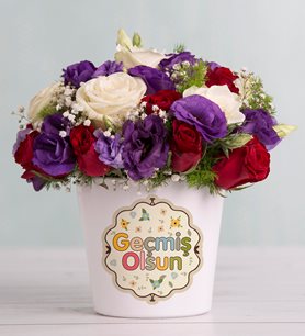 geçmiş olsun mesajlı seramik saksıda güller ve kırmızı güller ve beyaz lisyantuslar ve mor lisyantuslar sevdiklerinizi mutluı etmek çok kolay geçmiş olsun en iyi çiçegi