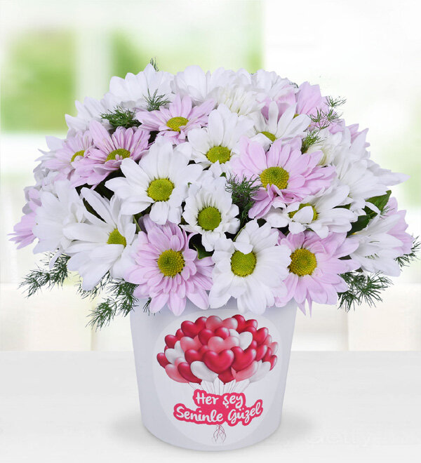 hersey seninle güzel yazılı seramik saksı ve papatyalar ile sevdiklerinizin gününe gün katacaksınız