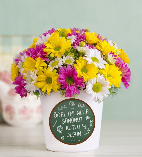 Koyu pembe, beyaz ve sarı papatyalar en güzel buluşmasını yaptı. Öğretmenler Gününüz Kutlu Olsun Stickerlı Rengarenk Papatya Aranjmanı, bahar çiçeklerinin mis kokusu ile en sevdiğiniz öğretmenlerin gününü kutlamaya geliyor.