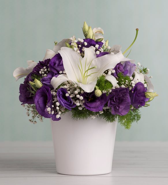 seramik vazoda mor lisyantular ve beyaz lilyumlarla hazırlanan okyanus büyüsü arajamnı sevdiklerinizin özel anlarına tarifsiz mutluluk katacak.
