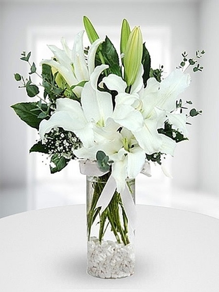 cam vazo içerisinde 3 dal lilyum şık sefafvazoda hazırlanış lilyum çiçekleri