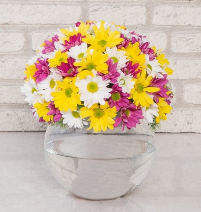 renga renk papatyalar ile hazırlanan arajaman paşabahçe cam fanus içerisinde hazırlanan papatyalar.
