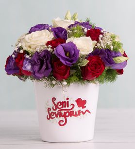 seni seviyorum seramik saksıda lisyantus ve kırmızı güllerden oluşan arajman.