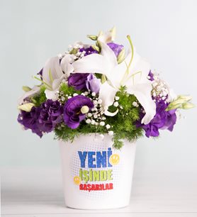 yeni işin ilk günü sitresi yerine mutluluk yaşatsın.yeni iş mesajlı vazo mor lisyantuslar ve beyaz lilyumlar hazırlanmış yeni iş tebrikli lilyum ve lisyantus arajmanı sevdiklerinizi ilk iş gününde mutlu edecek