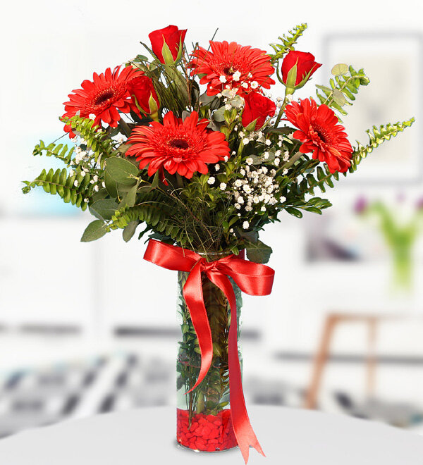 Çiçek bir günü değil her günü güzelleştirir. Yoğun geçen bir günün ortasında gelen bir çiçek buketi veya aranjmanı tüm stresi alır ve kişiyi daha canlı kılar. Silindir cam vazo içindeki kırmızı gül ve kırmızı gerberanın uyumlu birlikteliğiyle sevdiğiniz insanları mutlu edebilirsiniz.