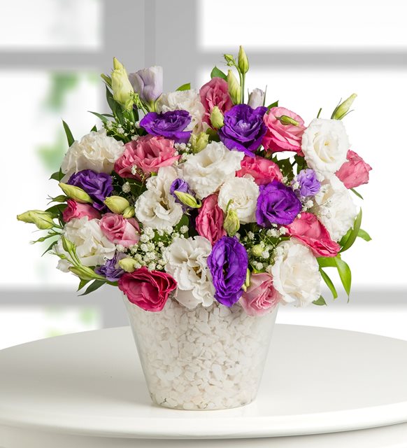süprizlerin en renklisi en özeli bu essiz arajamanda sevdiklerinizi bekliyor.konik cam vazoda yeşilliklerle süslenmiş renkli lisyantus arajamnı