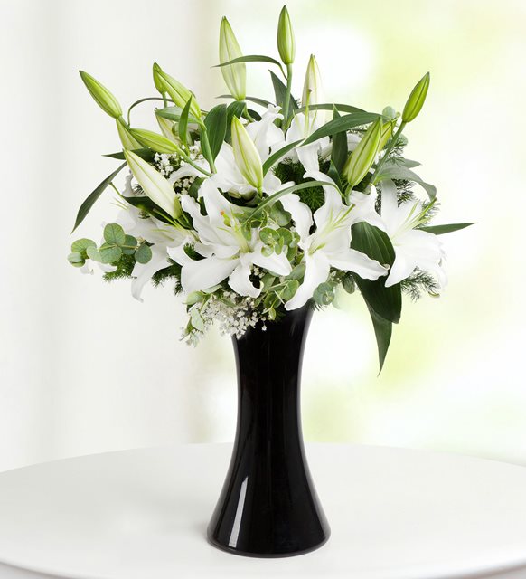 bem beyaz ve çok özel .siyah cam vazoda yeşilliklerle süslenmiş beyaz lilyumlarla hazırlanmış.zarif kugu çiçek arajmanı ile sevdiklerinize zarif bir cest yapın dortyolcicek.com özel arajmanı
